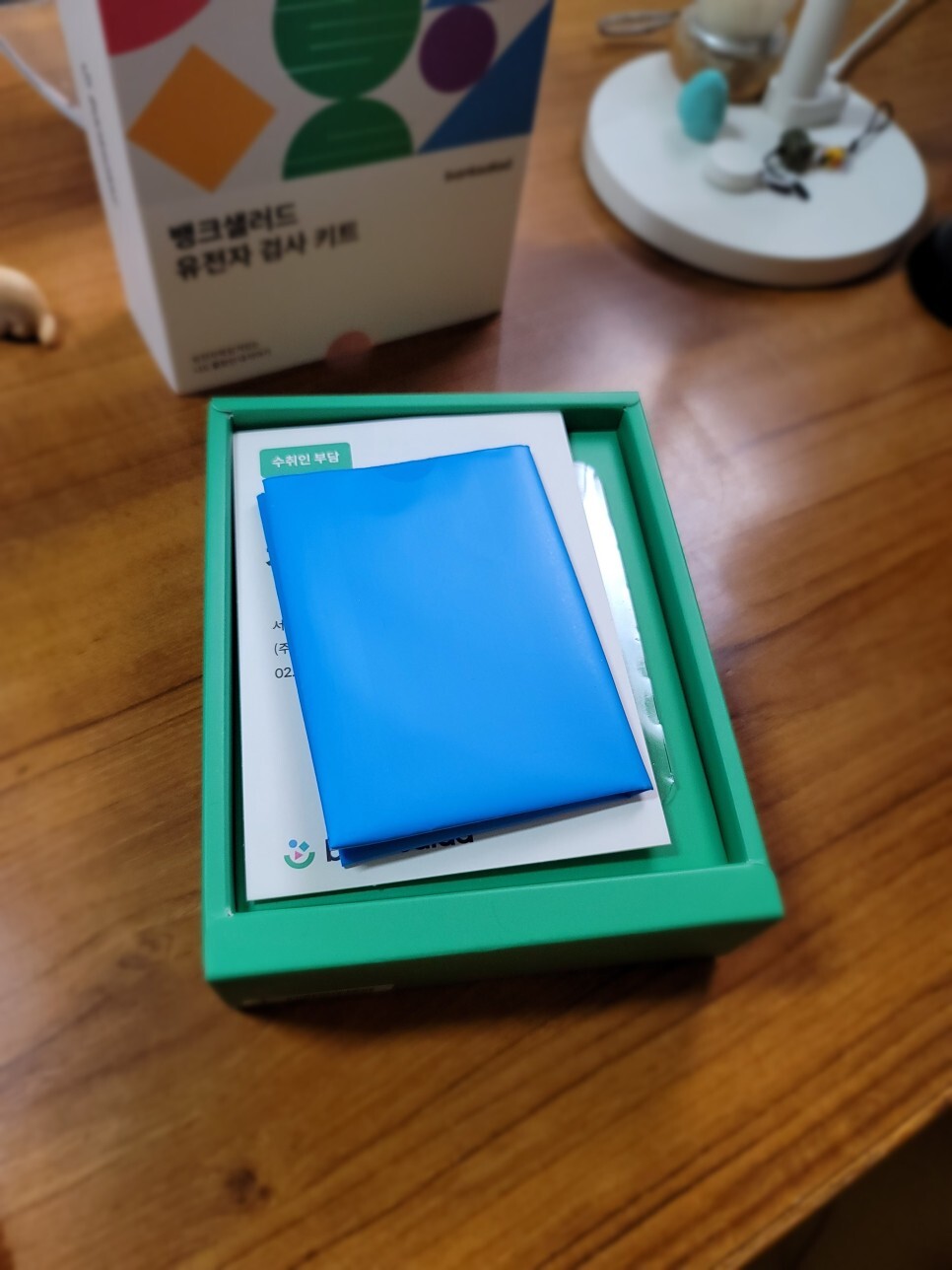 뚜껑을 열어보았다. 반송용 비닐봉투와 함께 설명서와 침채취키트가 동봉 되어 있다.